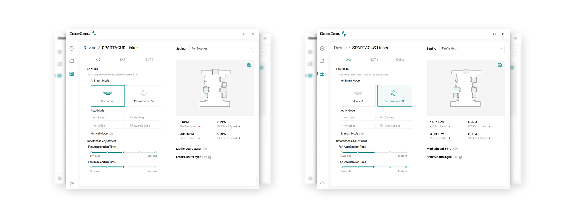 With the upgraded DeepCreative software, the SPARTACUS 360 offers dynamic control over cooling performance and acoustics. Users can seamlessly switch between AI-driven automatic balancing or tailored Environmental Modes, including Sleep, Office, Gaming, and Overclocking, ensuring optimal performance and noise levels for any scenario.