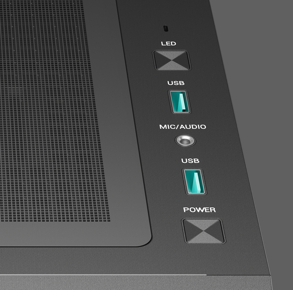 Along with two USB 3.0 ports and a combination audio/mic jack, the reset button is custom configured to control preset lighting effects on the three pre-installed ARGB fans.