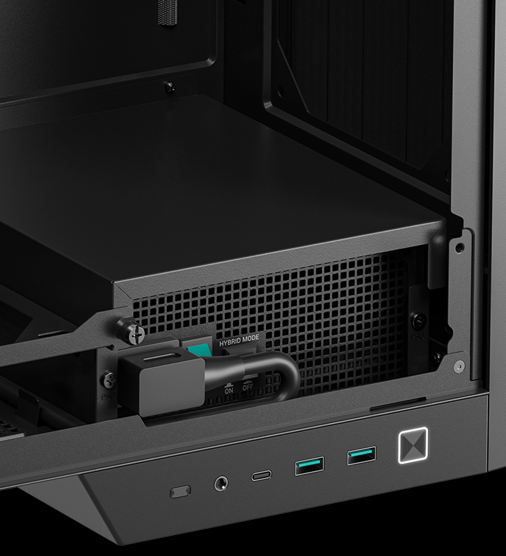The PSU is mounted horizontally at the front, with its connector ports facing outward.