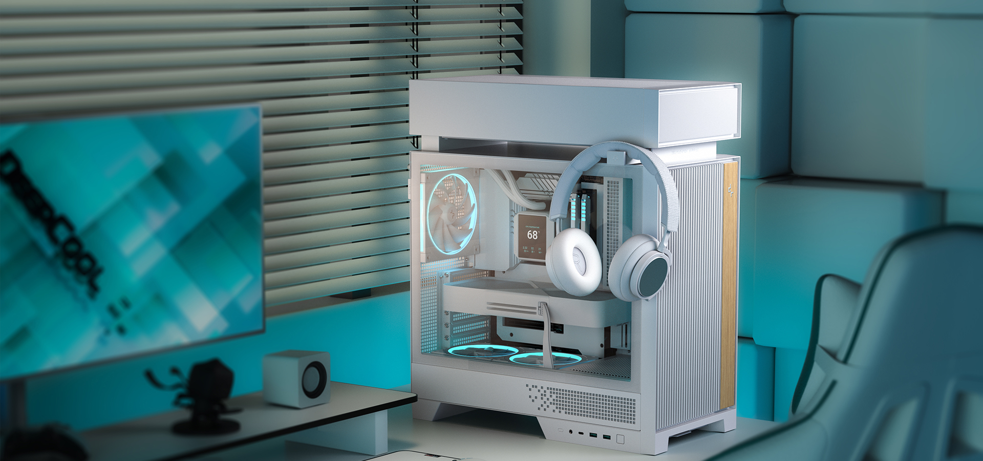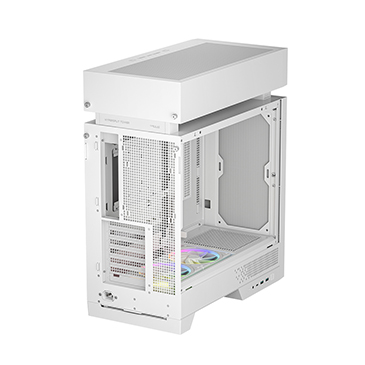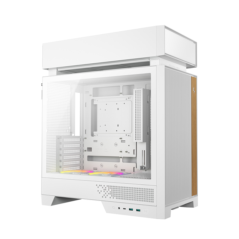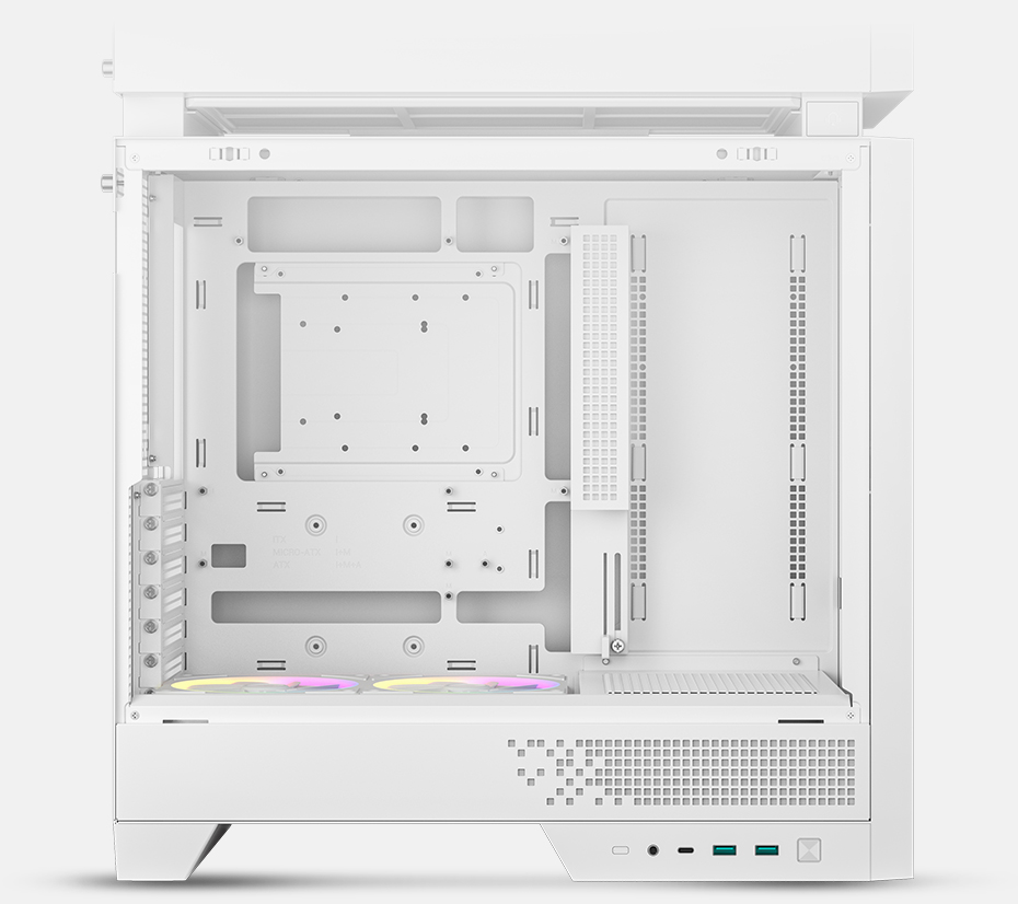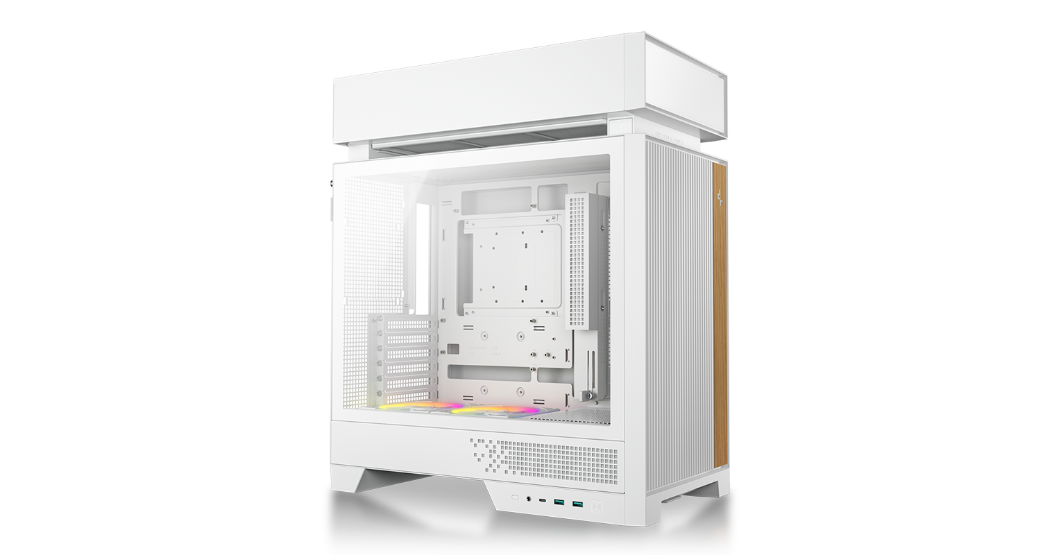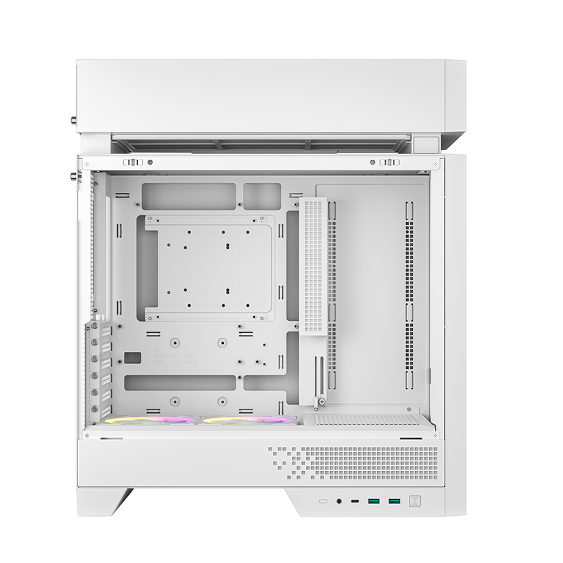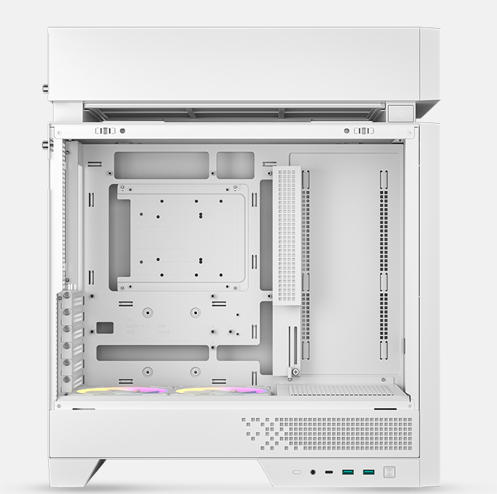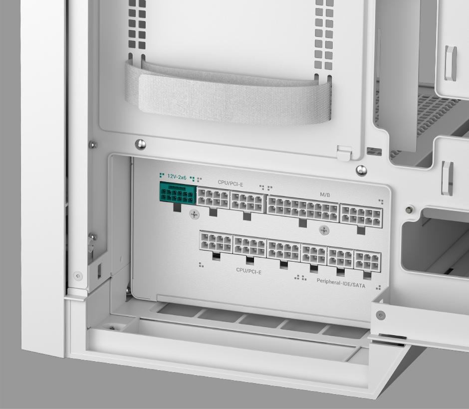 The PSU mounted horizontally at the front, with cable connections face the back of the motherboard.