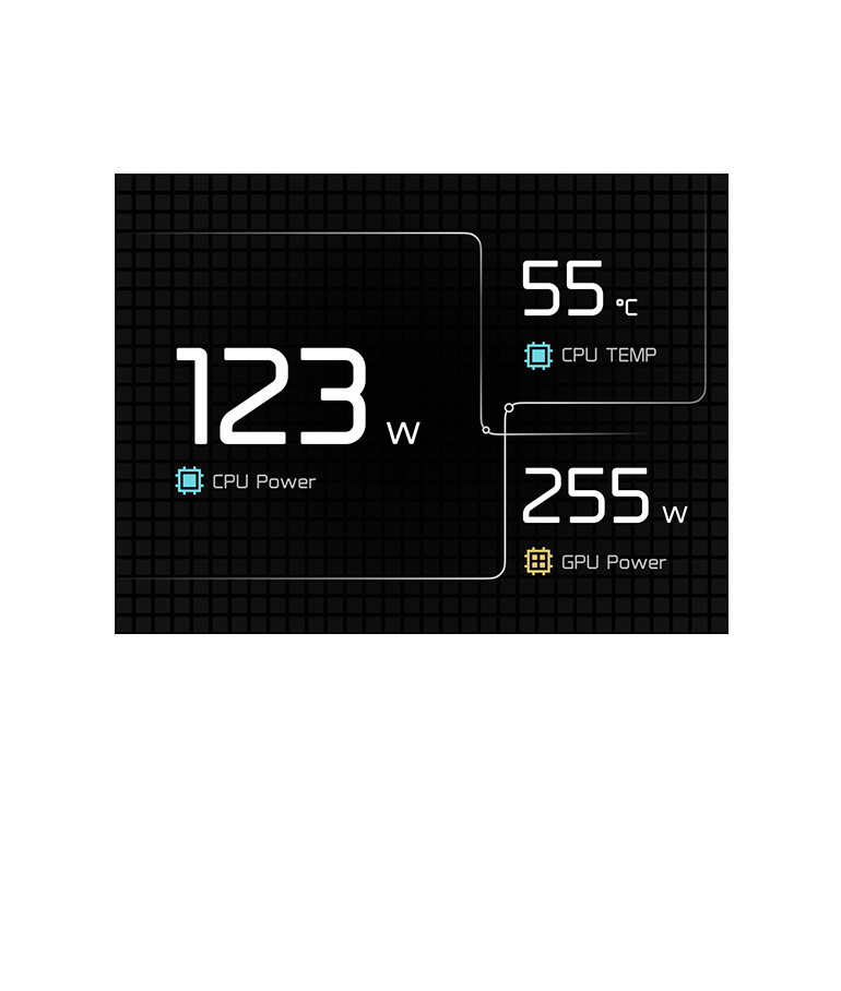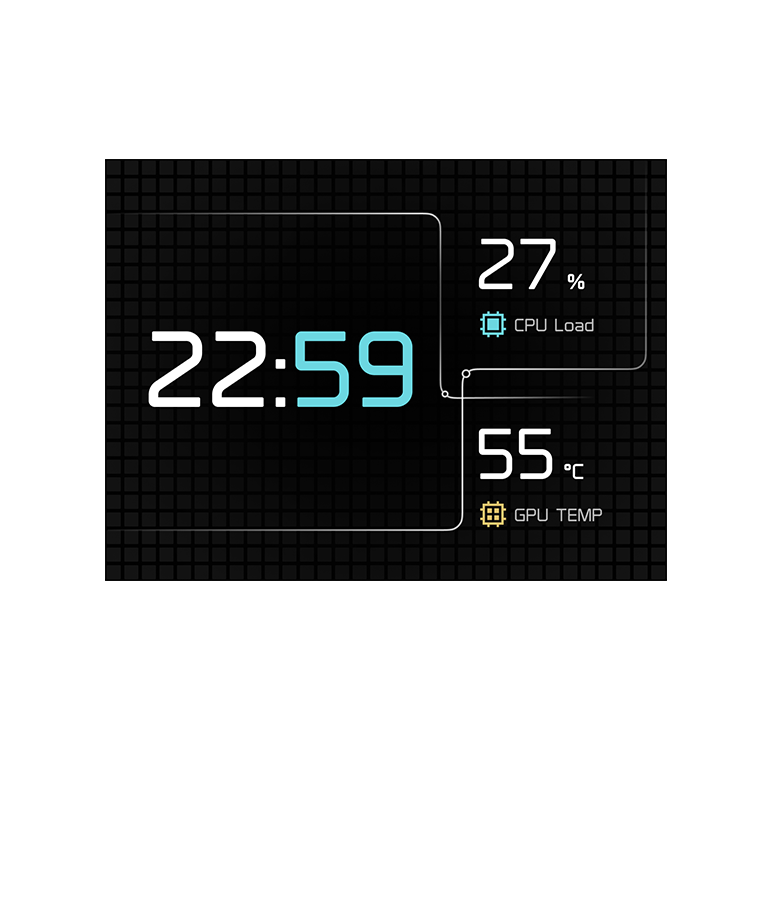 View essential system information with a structured layout. Highlight key stats like CPU temperature, power consumption, or time in the primary display area, while secondary areas show additional metrics like GPU status and memory usage.
