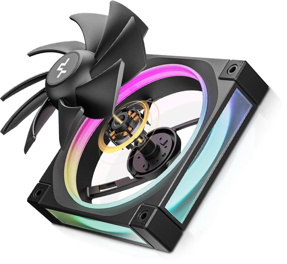 The FL12 fans frame the radiator with vivid ARGB halos, flowing in perfect sync with the pump head to create unified lighting. Built with Fluid Dynamic Bearings, they help ensure quiet, consistent operation for long-term use.
