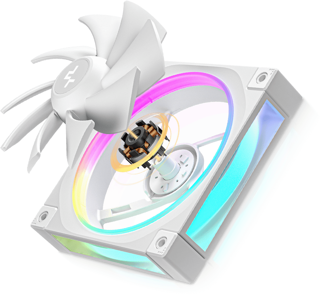 The FL12 fans frame the radiator with vivid ARGB halos, flowing in perfect sync with the pump head to create unified lighting. Built with Fluid Dynamic Bearings, they help ensure quiet, consistent operation for long-term use.