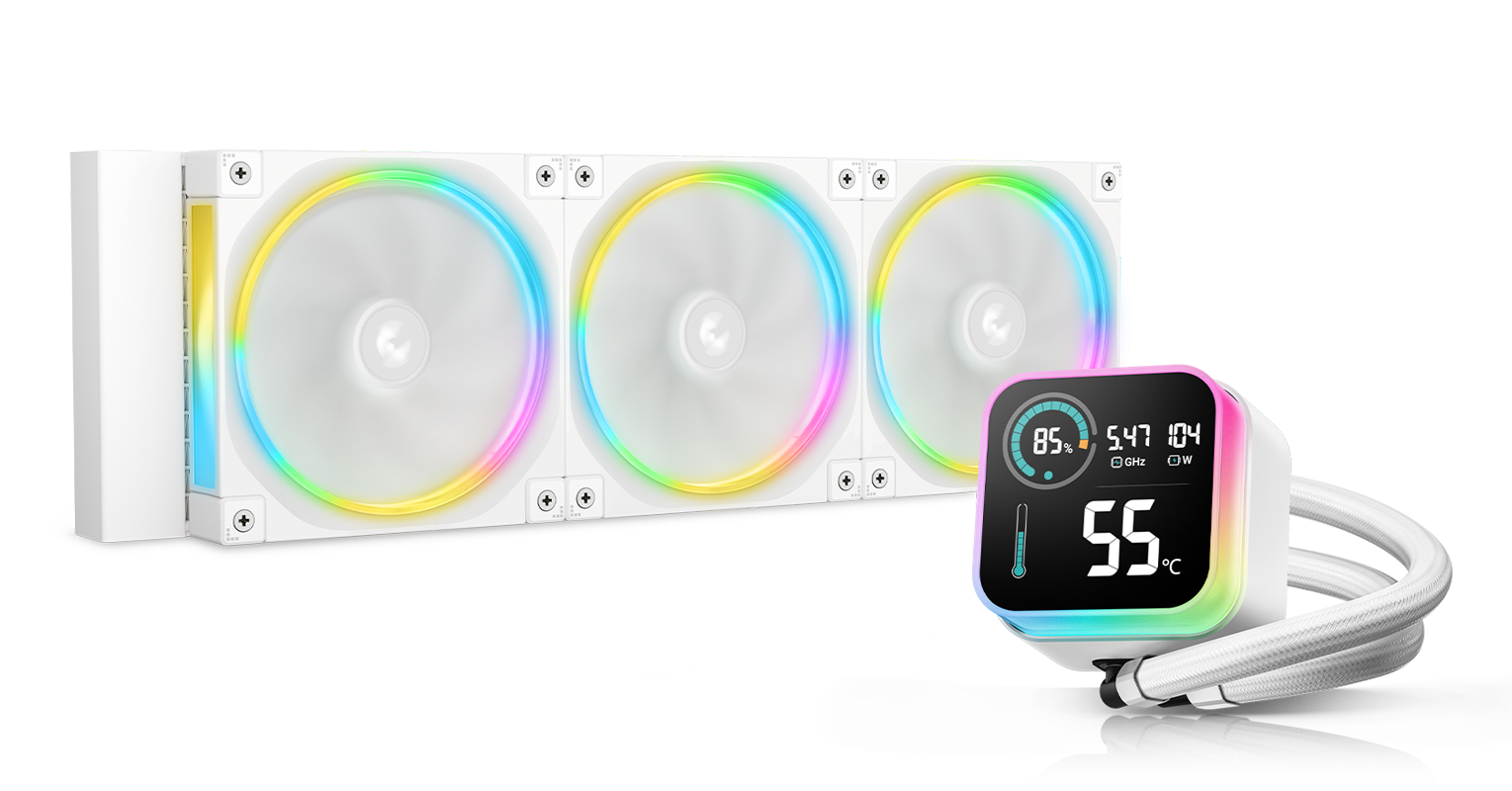 The LQ360 ULTRA ARGB WH brings meaningful upgrades in cooling efficiency and visual polish with a 6th-gen pump and FL12 fans, while retaining the familiar LQ design with its ARGB halo magnetic pump block and segmented LCD screen.