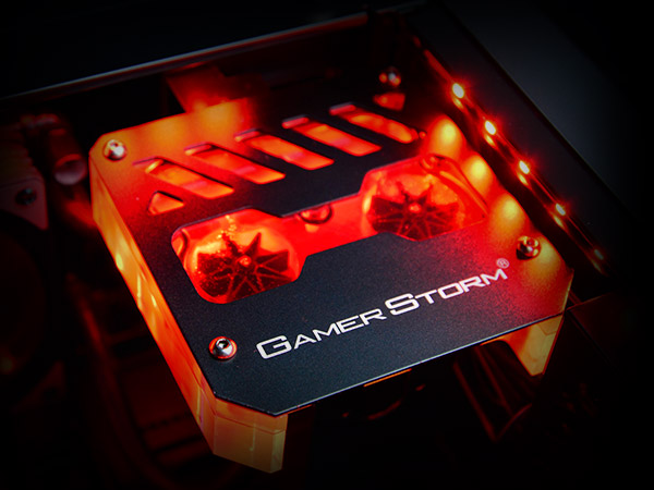 A Custom LED light panel featuring the Gamer Storm brand mounted vertically gives a premium quality to the personalized lighting effects.