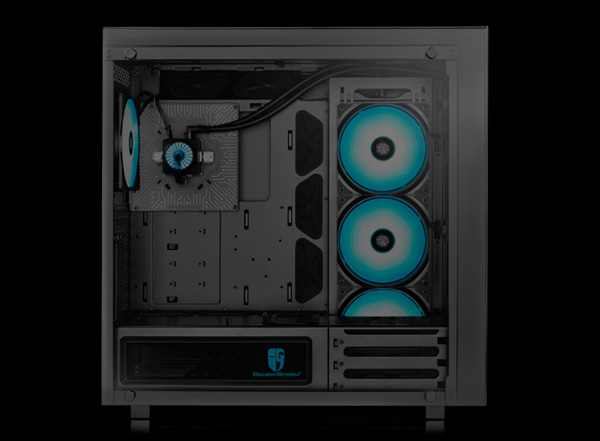 A wide variety of cooling solutions can be accommodated, with the facility to install 120, 240 or 360mm radiator liquid cooler or three 120mm fans at the front. NEW ARK 90 pre-installed with a specially designed CAPTAIN Series Liquid Cooling System with 280mm Radiator. It also has three 140mm RGB fans vertically installed on the side panel which can reduce the impact on CPU heat dissipation performance caused by the graphic card.