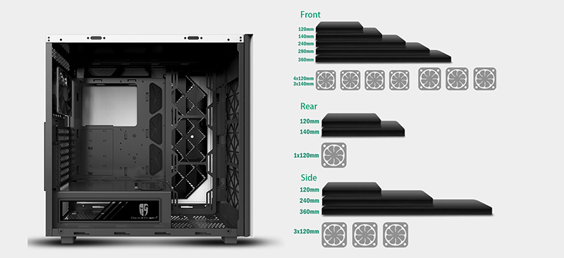 Dual air intake channels are hidden on both sides of the front panel. With the 6mm wide, low damping design, the intake channels provide abundant air flow for your system to breath.