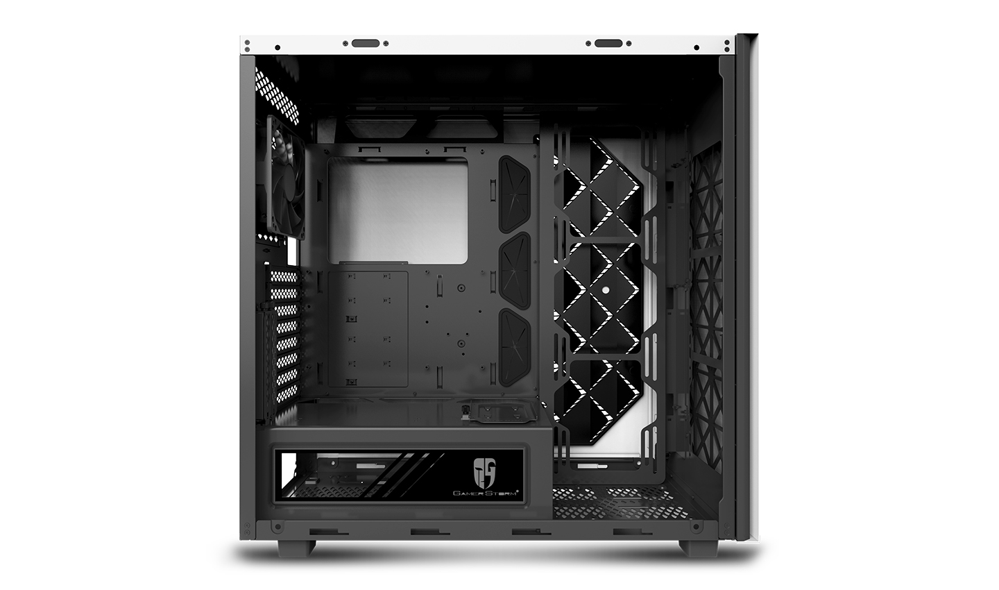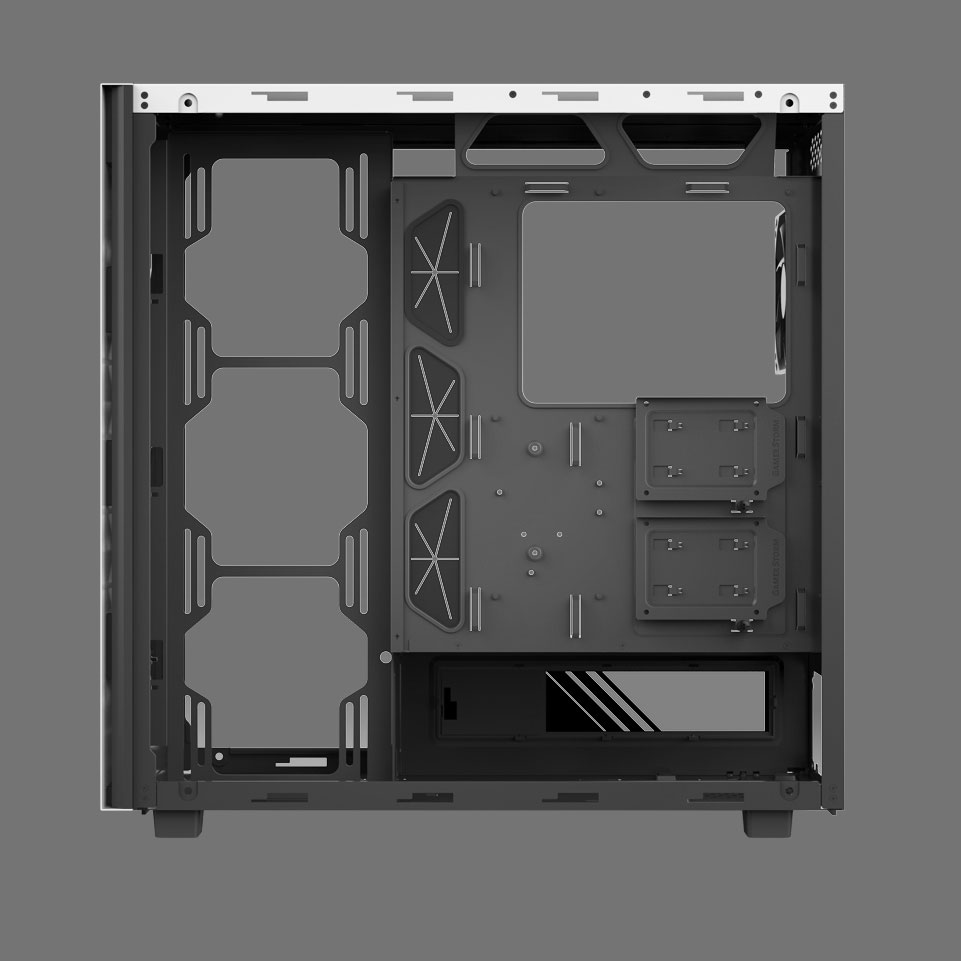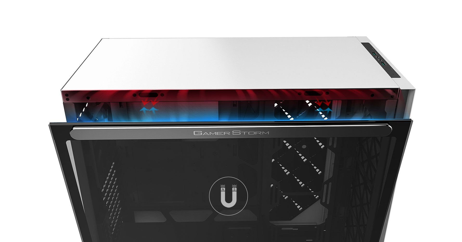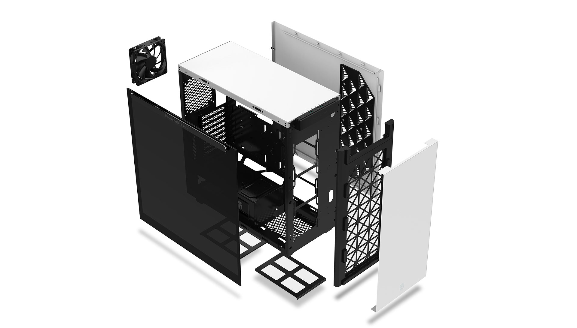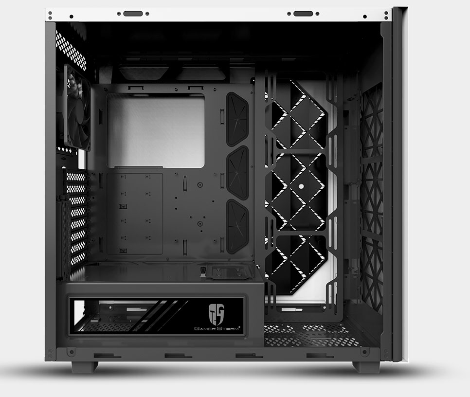 Left side panel is made of gray transparent tempered glass, mounted by permanent magnetic material that provides up to 24.5N of attraction force (approximately the gravity of 2.5Kg).