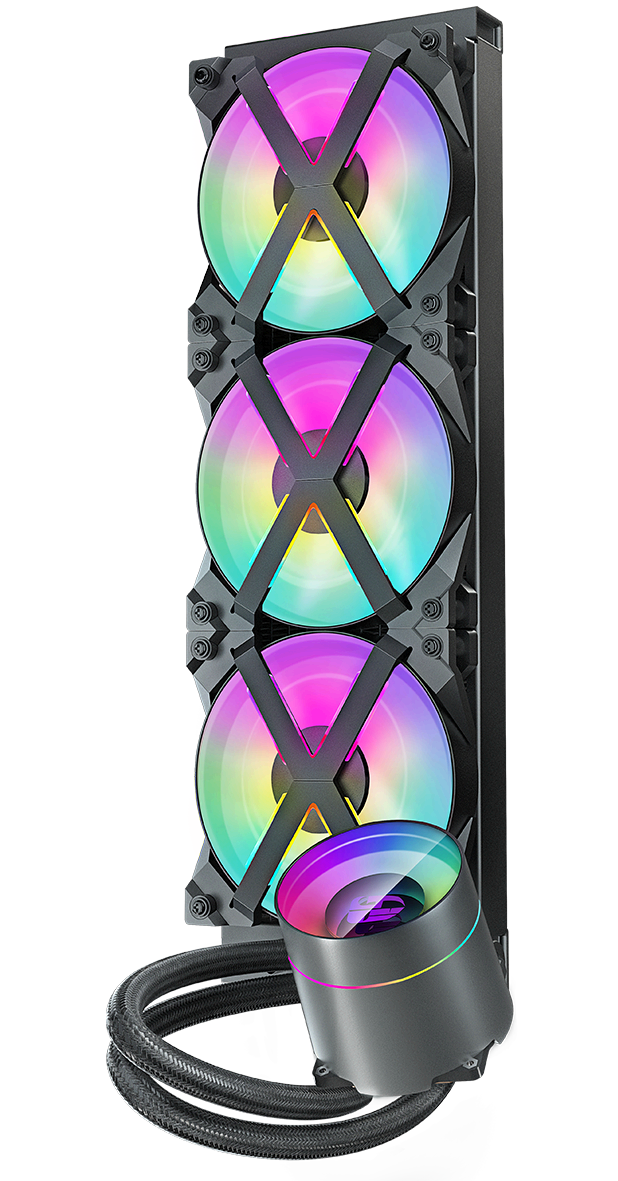 The CASTLE 360EX RGB AIO liquid CPU cooler provides high performance cooling with long-lasting durability and radiant RGB lighting featuring Anti-Leak technology and three premium MF120 GT fans.